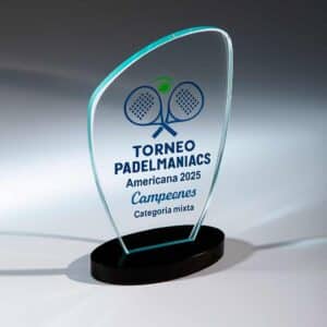 Trofeo de madera de haya con base de cristal para regalos personales o corporativos. Elige entre grabación UVI a color o grabación CO2. Incluye diseño, grabación y estuche.